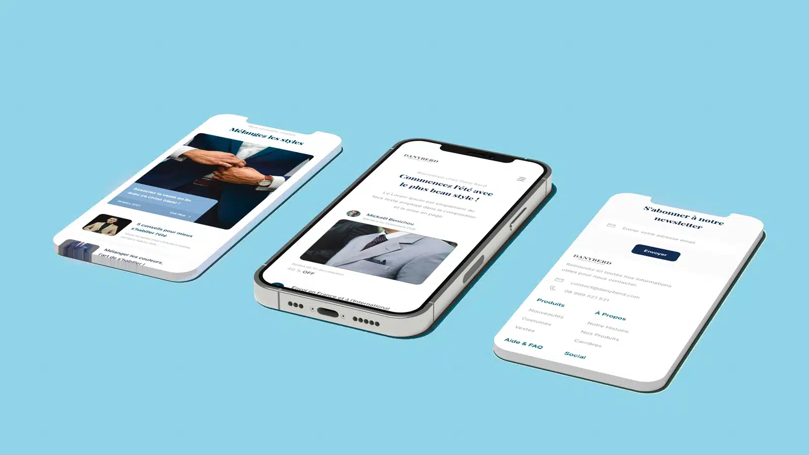 La maquette de Dany Berd présente une interface utilisateur élégante et moderne adaptée aux appareils mobiles. Elle met en avant une esthétique soignée avec des couleurs douces et des images de haute qualité, reflétant le caractère haut de gamme de la marque. Le design est conçu pour offrir une expérience utilisateur fluide et intuitive, avec des sections bien définies pour les conseils de mode, les produits, et l’inscription à la newsletter. Les informations essentielles, telles que les contacts et les liens vers les différentes sections du site, sont facilement accessibles, soulignant une approche centrée sur l’utilisateur et l’accessibilité.